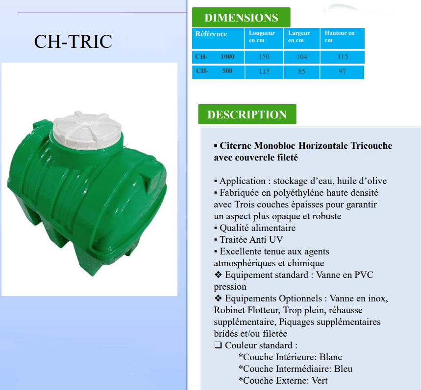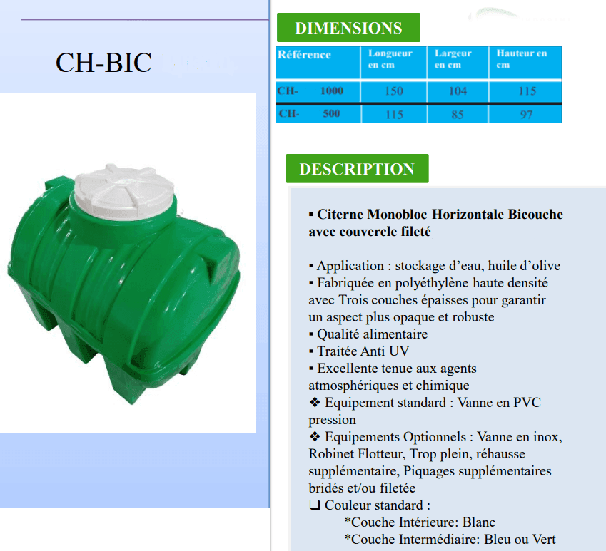 Sur Bricodari.tn, vous trouverez une large gamme de citernes alimentaires disponibles en plusieurs capacités (500 L, 1000 L, 2000 L, et plus). Nos produits sont certifiés pour l’eau potable, proposés à prix compétitifs, avec une livraison rapide partout en Tunisie, pour plus d’info contacter : 55 59 56 56.