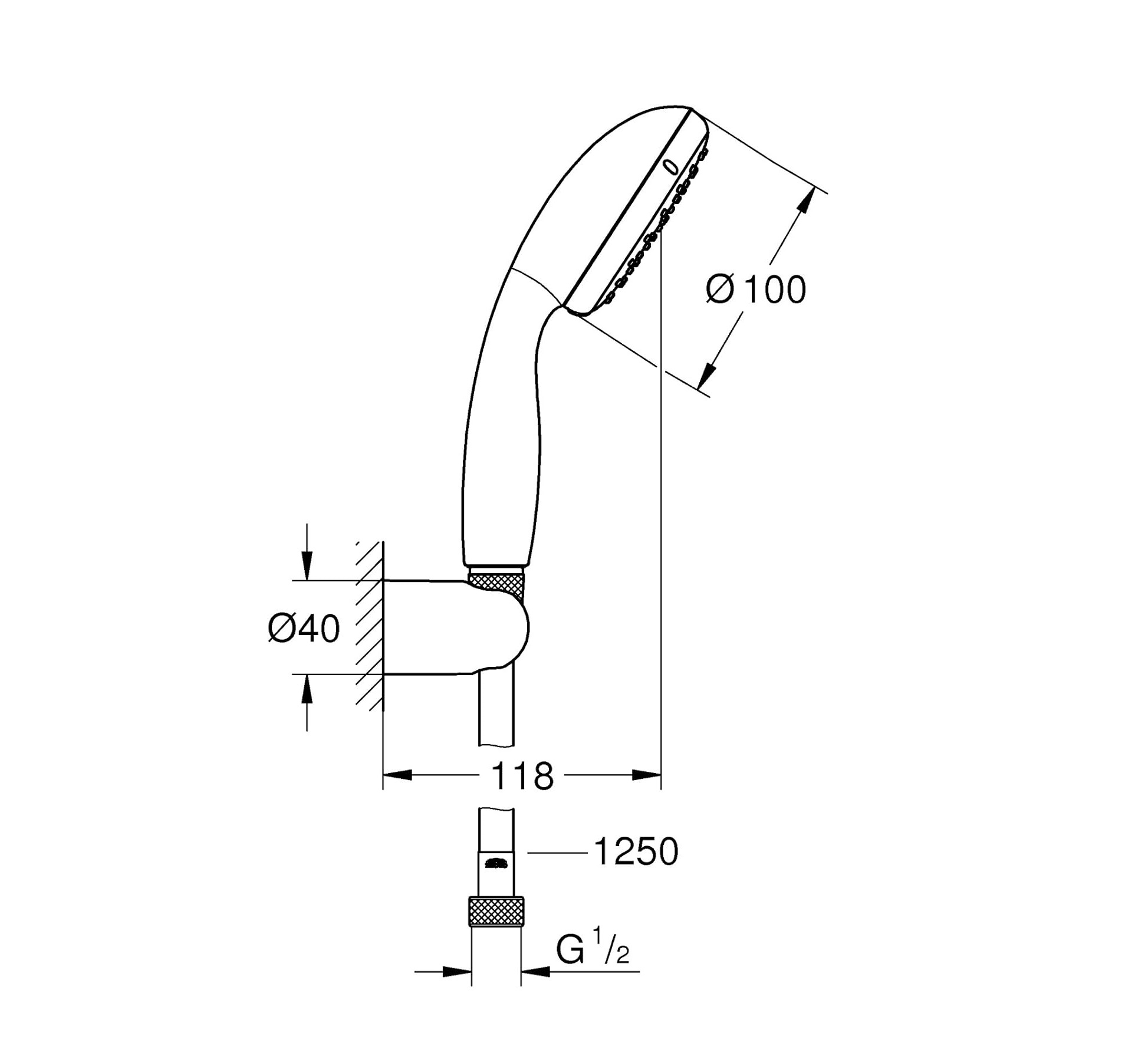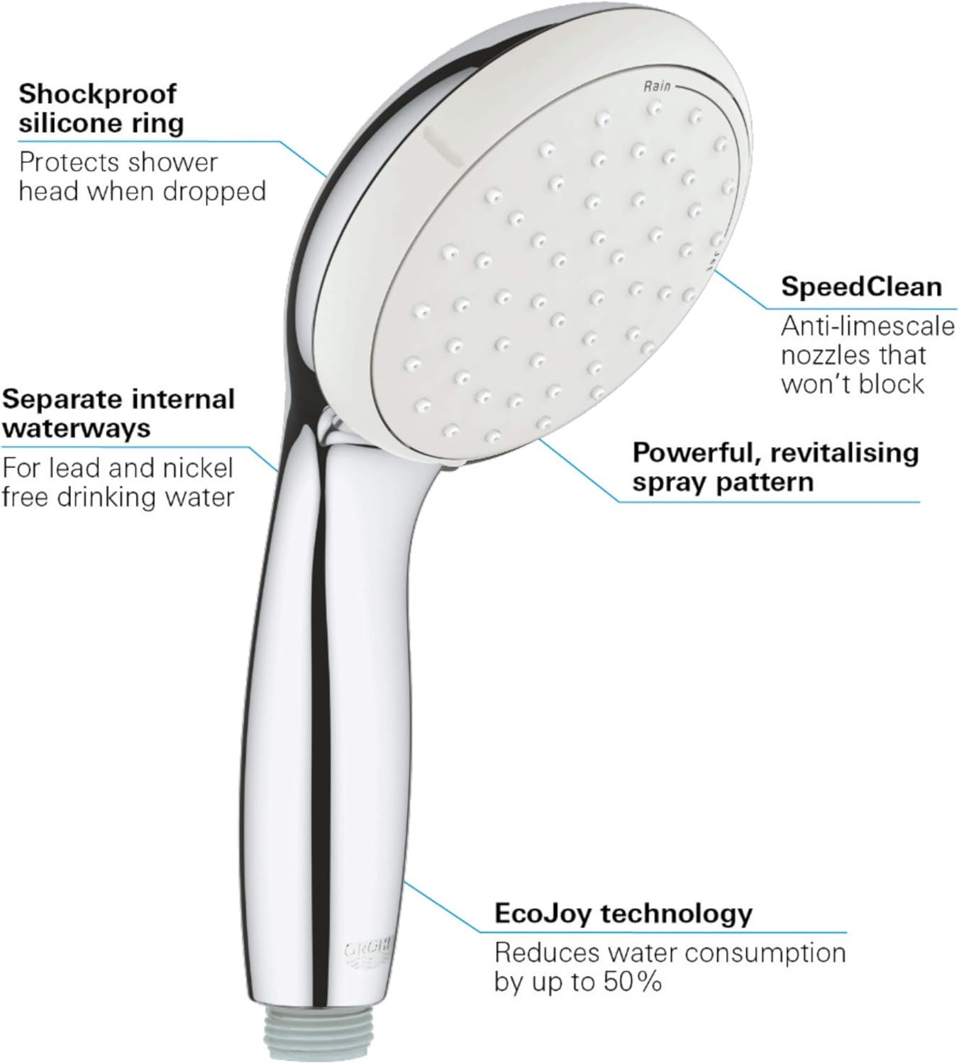 Reference: 27 798 10E • Composé de : • Douchette Tempesta 100 II (27 597) • Support mural pour douchette (28 605) • Non orientable • Flexible Relexaflex 1.250 mm (28 150) • GROHE EcoJoy régulateur de débit 5,7 l/min • GROHE DreamSpray jet parfaitement uniforme • GROHE Long-Life finition durable • Procédé anti-calcaire SpeedClean • ShockProof anneau en silicone protecteur en cas de chute