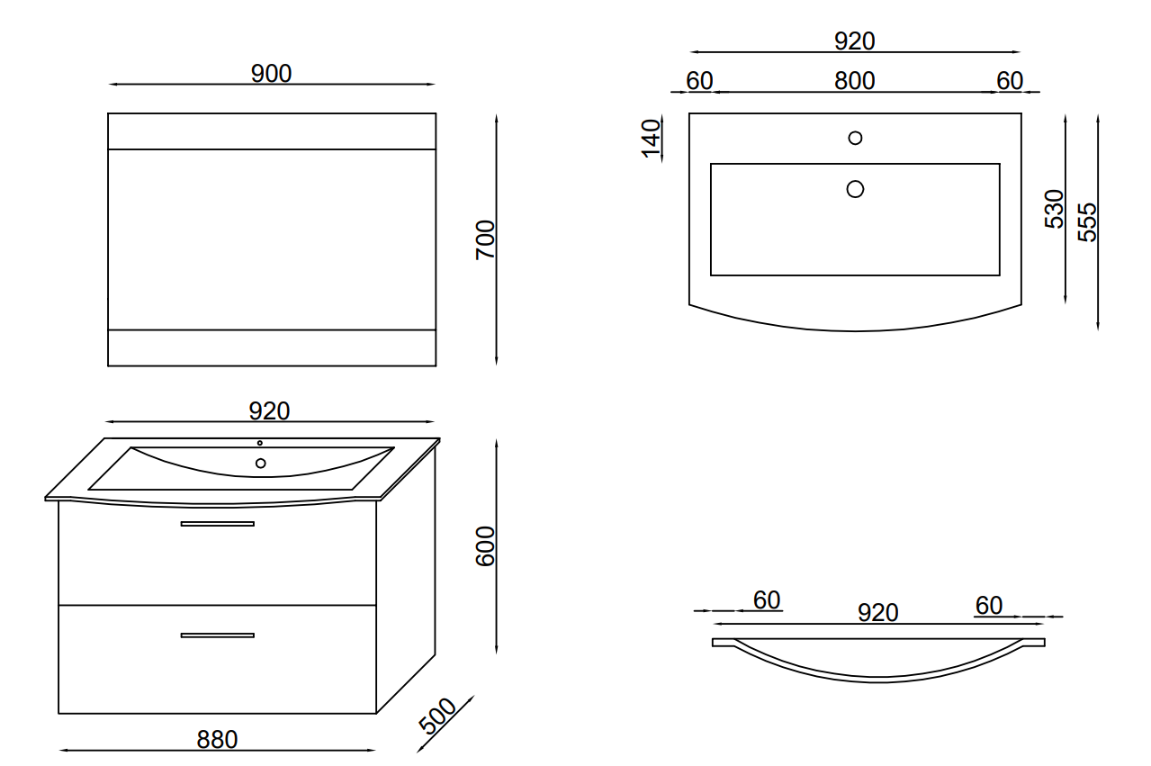Meuble salle de bain pour plan vasque Lido 92 cm avec miroir deux tiroirs hydrofuge